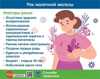 К неуправляемым факторам риска относятся: Возраст. В 77% случаев опухоли возникают у людей после 50 лет. Пол. Чаще раком молочной железы болеют женщины, у мужчин заболевание встречается примерно в одном случае из ста. Высокая плотность молочной железы. У женщин с плотной молочной железой рак груди развивается чаще. Кроме того, более плотная ткань на маммограмме выглядит сплошным белым пятном. В таком случае стоит выполнять УЗИ молочной железы. Генетические факторы. У некоторых женщин риск очень высок из-за генетической мутации, унаследованной от одного из их родителей. Вероятность развития рака в этом случае 60-80%, часто в молодом возрасте. Опухоль молочной железы в анамнезе. Риск развития злокачественного новообразования во второй молочной железе повышается в 3-4 раза, если пациентка уже проходила лечение этого заболевания ранее. Ионизирующая радиация. Повышенная заболеваемость раком груди наблюдалась у женщин, получивших высокие дозы рентгеновского излучения из-за послеродового мастита, а также у молодых пациентов, перенесших более 100 флюорографических исследований за несколько лет из-за туберкулеза легких. Раннее начало менструального цикла – в 11-12 лет и поздняя менопауза – после 55 лет. Длительное воздействие эстрогена и прогестерона в течение жизни та же может спровоцировать развитие опухоли. К управляемым факторам риска относят: Рождение детей. исследователи рака не рекомендуют затягивать с рождением детей. Риск заболевания уменьшается и с каждыми последующими беременностью и родами. Грудное вскармливание. Ряд исследований предполагает, что длительное грудное вскармливание несколько снижает риск развития заболевания. Пищевые привычки и избыточный вес. Избыточная масса тела, увлечение пищей, богатой жирами, – доказанные факторы риска развития рака молочной железы. Важным фактором риска является ожирение, особенно после наступления менопаузы. Жировая ткань фактически создает эстрогеноподобные соединения. Физическая активность. Исследования показали, что регулярные занятия спортом на 18% снижали риск развития рака груди у женщин в менопаузе. Алкоголь. Даже прием несколько порций алкоголя в неделю связаны с повышенным риском рака груди у женщин. Алкоголь способен повышать уровень эстрогена в организме, что может быть причиной увеличения риска. Прием гормональных препаратов. Как правило, речь идет о противозачаточных препаратах или о гормонозаместительной терапии в период менопаузы. Поэтому эту терапию (включая фитогормоны) должен назначать только врач, тщательно взвешивая риски и пользу. | |
