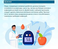 Если у человека диагностирован сахарный диабет, он находится в группе риска по стоматологическим заболеваниям. Необходимо обращать внимание на любые неблагоприятные изменения в ротовой полости и своевременно обращаться к врачу.
